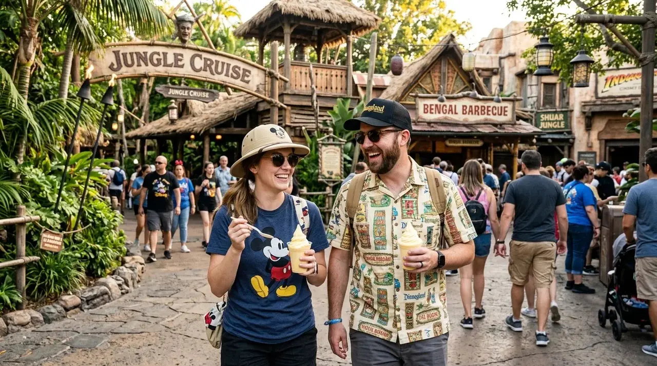 Blue Bayou Restaurant — the only restaurant in any Disney park physically located inside a ride, sitting on the bayou at the entrance to Pirates of the Caribbean. The Monte Cristo sandwich is an institution. This is the quintessential Disneyland adult lunch and one of the most atmospheric dining experiences at any theme park anywhere. Reservations are essential and book weeks in advance — if you missed the 60-day window, check the app daily for cancellations. If you couldn’t get a reservation, Bengal Barbecue in Adventureland is the best quick-service alternative — grilled skewers, fresh pineapple spears, and shaded outdoor seating.