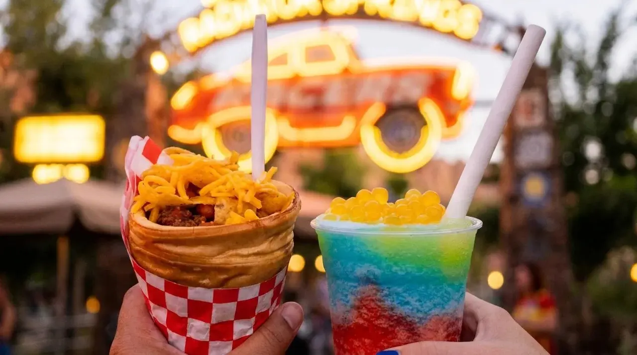 The quintessential Cars Land snack. Chili cheese served in a traffic cone-shaped cup, paired with a frozen lemonade in a matching cone. The chili queso is rich and filling — order the small if you have more park eating to do. The frozen lemonade cuts through the richness perfectly. Neither is extraordinary on its own but together they’re a Cars Land ritual that makes the land feel complete.