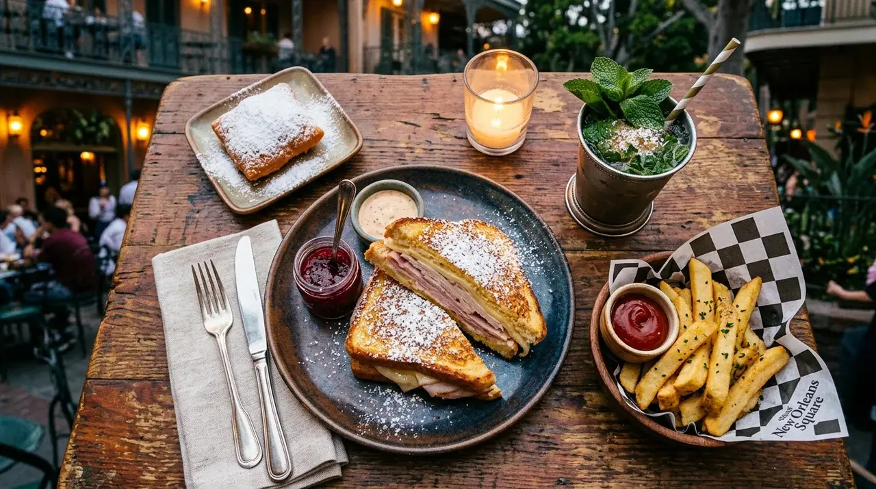 The menu features French-Creole inspired dishes at more accessible prices than Blue Bayou. The signature item is the Monte Cristo sandwich — a deep-fried powdered-sugar dusted sandwich that generates genuine devotion among Disneyland regulars. The Pommes Frites (thick-cut fries with dipping sauces) are another standout. The restaurant also offers a Fantasmic! dining package.