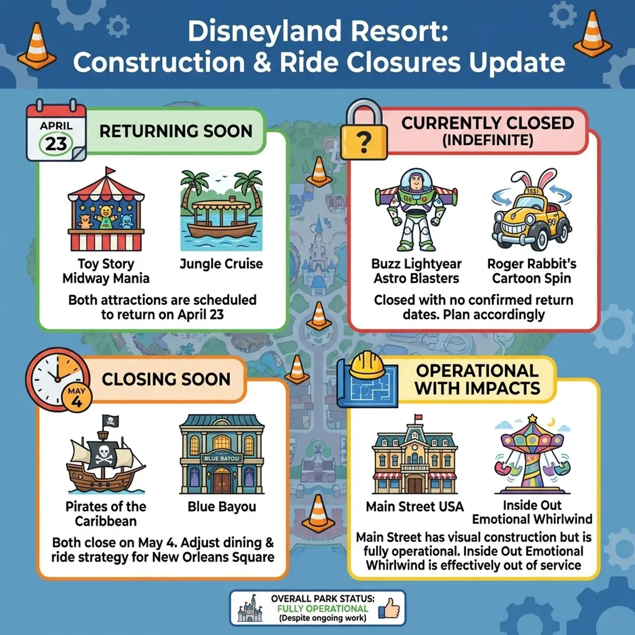 - Pirates of the Caribbean and Blue Bayou both close May 4 — plan New Orleans Square dining and ride strategy accordingly