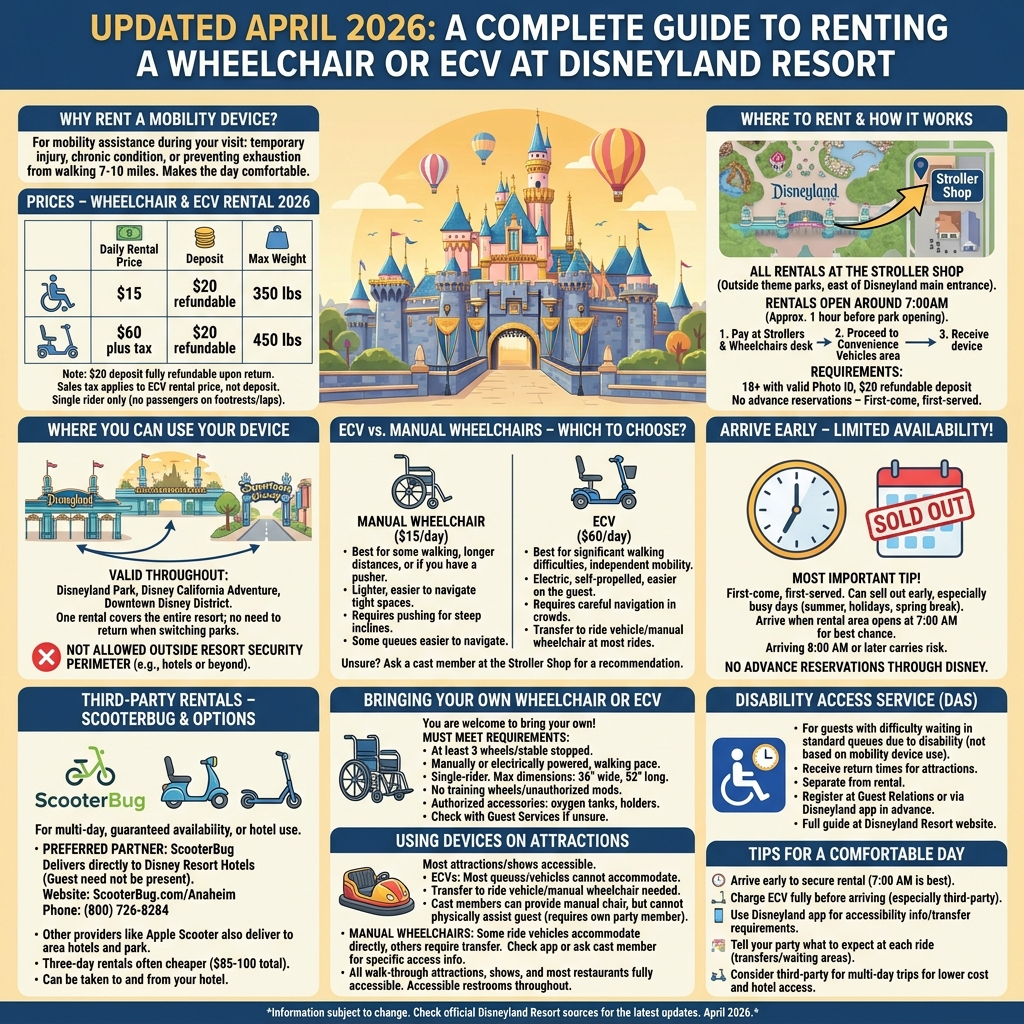 Updated April 2026. A complete guide to renting a wheelchair or electric conveyance vehicle (ECV) at Disneyland Resort, including prices, where to rent, how the process works, and tips for getting the most out of your mobility device at both parks.
