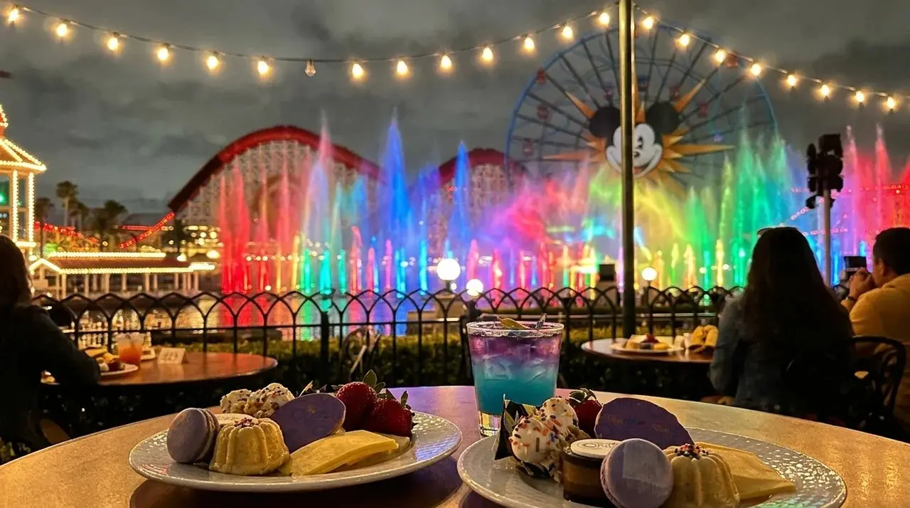The World of Color Dessert Party is a paid add-on experience at Disney California Adventure. You get a reserved table in the World of Color viewing area, a plate of desserts and savory items, and drinks. Adults 21 and older also get alcoholic beverages included.